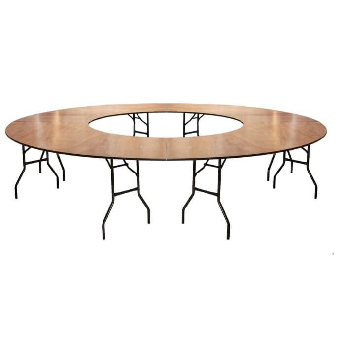 Our Serpentine Crescent Wooden Folding Table is ideal when creating round table designs or 360-degree bar areas. It requires no assembly and can be used by simply unfolding the table legs. It packs flat and can be stored anywhere, it can also be stored on our industrial-strength folding table trolley. Our folding plywood tables are in stock and may be delivered the next day! Our folding plywood tables have plastic feet to help prevent scratching various floor surfaces. The 6 layers of varnish protect the tabletop from moisture damage and give the plywood folding table a very nice finish. Strictly Tables and Chairs plywood folding tables have a 19.5mm thick heavy-duty tabletop that is suitable for contract use. The American wishbone legs are coated with a moisture-resistant powder to prevent corrosion. The industrial-strength locking mechanism makes our plywood folding table an industrial-use table suitable for any event. Our wooden folding table is protected by high-grade PVC edging which is tongue and grooved into place. Strong wooden battens ensure a sturdy build and protect the tables when being stored. Our wooden trestle table can be moved using our industrial-strength folding table trolley. The wooden trestle table trolley can be used to store the tables also. Strictly Tables and Chairs also offer after-sale support. We stock Default and replacement parts for all of our wooden banqueting tables. We offer replacement PVC edging, plastic table feet, and linens. Remember we also supply heavy-duty folding banquet tables and high-quality stacking chairs to complement all our wooden trestle tables.