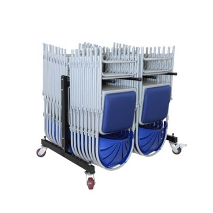Our folding chair trolley with two columns allows for you to hang your folding chairs and store them directly on the trolley. As with the other folding chair trolleys in this range this is also manufactured using a heavy duty steel frame which is powder coated in black. The trolley has four swivel castors and also has two castors with brakes, perfect for securing the chairs in place. All of the products we sell on Strictly Tables and Chairs are heavy duty and built for contract use, our customers include marquee hire companies, hotels, pubs and schools. Please be advised that when purchasing a table trolley you ensure that there is sufficient space to use the trolley. We always advise to check door width so that there is enough room for the trolley to fit through the doors at your venue.