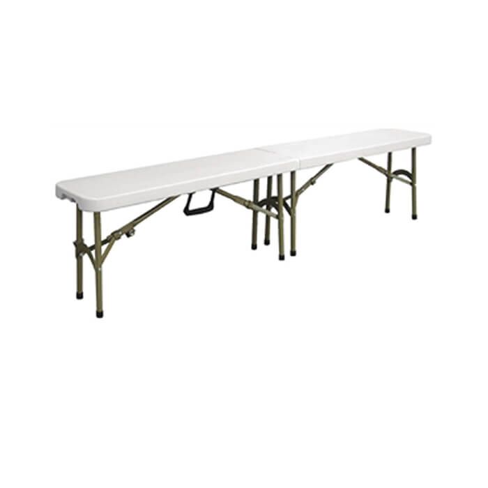 We are proud to present our plastic folding bench, ideal for camping, caravan sites and garden parties. The plastic folding bench is the perfect way to add extra seating to any party or event. Made from high quality blow moulded plastic and with 4 sets of legs this is a truly heavy duty plastic folding bench. The plastic seat folds in half and the table legs fold up into the base making for a space saving piece of furniture. Can be used with one of our plastic folding tables to create the perfect outdoor garden picnic or party setting. The easy clean seat is made of hygienic easy clean blow moulded plastic that means you can use this plastic folding bench indoors and outdoors. When looking to use this as outdoor seating it suits football games, events and carnivals as it is made for contract use.
