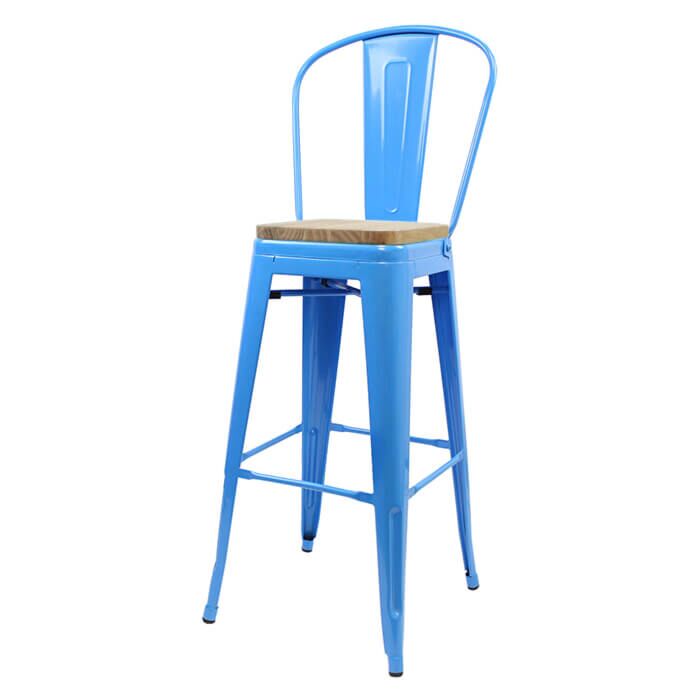 Tolix Style 76cm Bar Height Stool with Tall Back Rest Blue with Wooden Seat