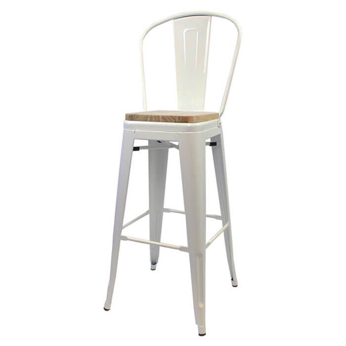 Tolix Style 76cm Bar Height Stool with Tall Back Rest White with Wooden Seat