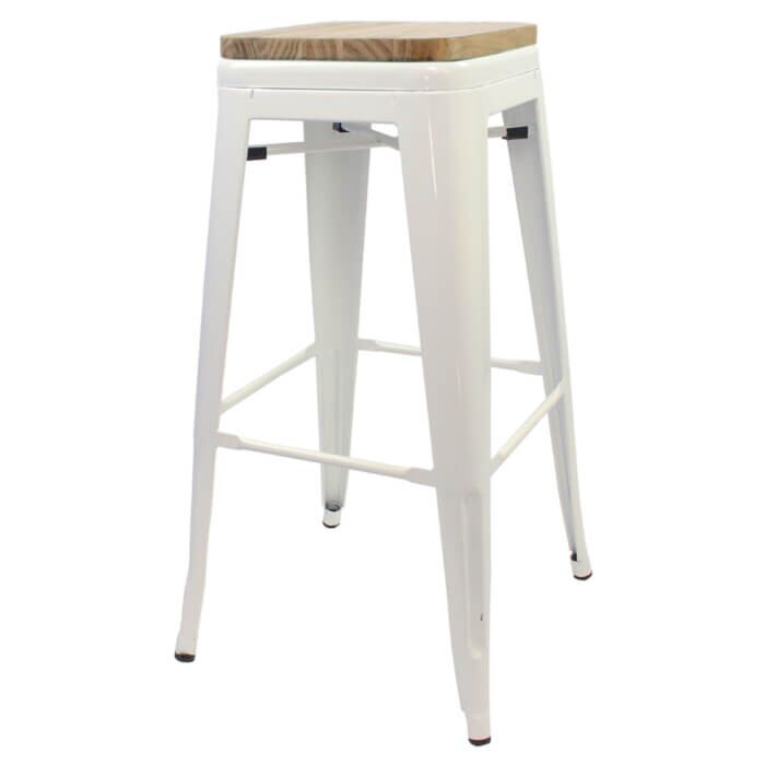 Tolix Style 76cm Bar Height Stool White with Wooden Seat