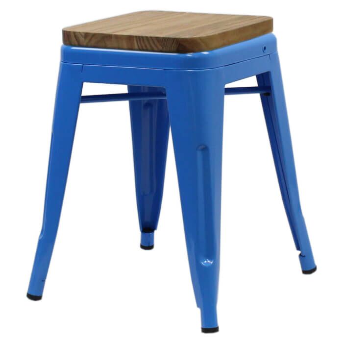 Tolix Style 46cm Low Stool Blue with Wooden Seat