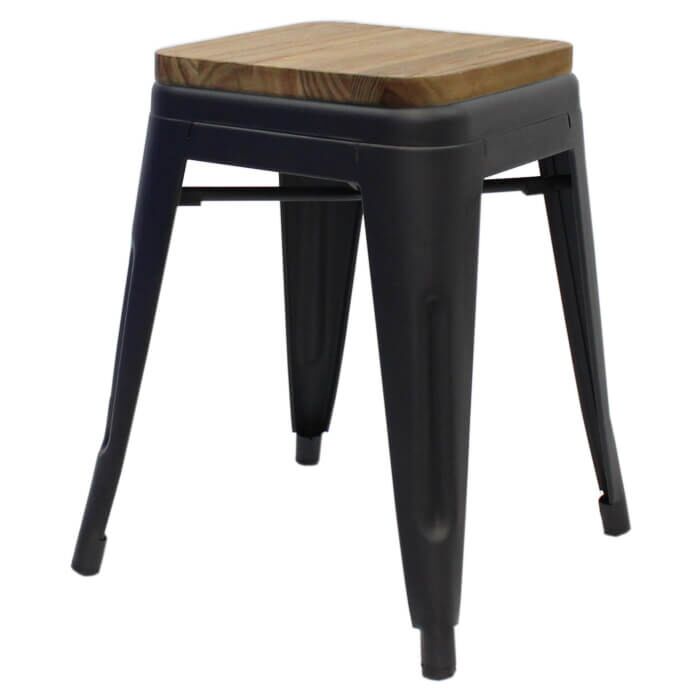 Tolix Style 46cm Low Stool Matte Black with Wooden Seat