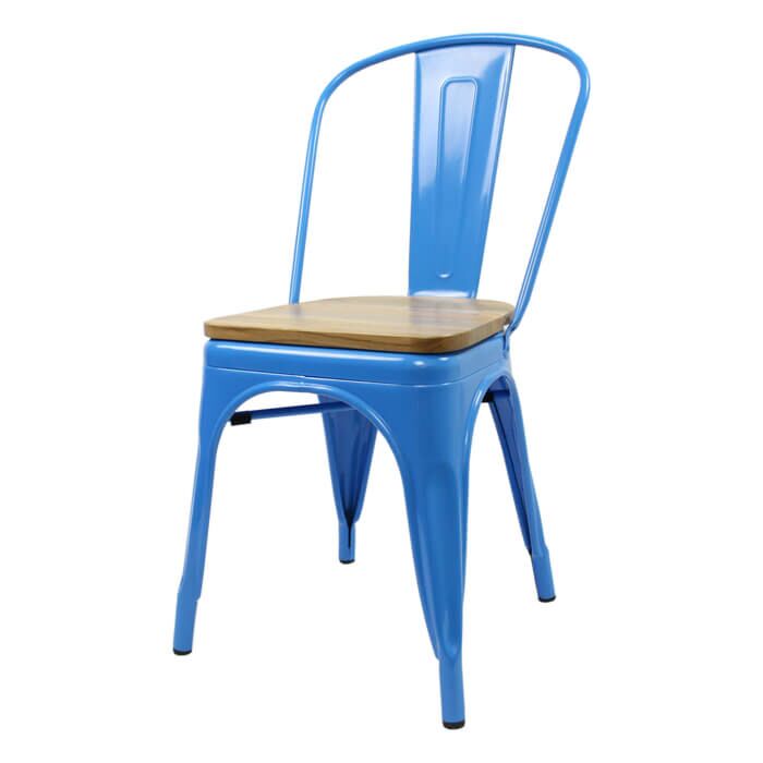 One of our more popular selling bistro chairs, the Blue Tolix-inspired Side Chair with Wooden Seat, offers a raw varnished finish, which gives the chair its industrial quality. This finish most reflects the age of the design and sits comfortably next to all surfaces. The industrial finish is seen in the slight differences in colour due to the variations in the original metal sheet. In addition, the welds and joins used to assemble the chair can be seen under the varnish, which all adds to the industrial look of the chair.