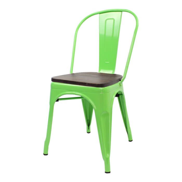 One of our more popular selling bistro chairs, the Green Tolix-inspired Side Chair with Wooden Seat, offers a raw varnished finish, which gives the chair its industrial quality. This finish most reflects the age of the design and sits comfortably next to all surfaces. The industrial finish is seen in the slight differences in colour due to the variations in the original metal sheet. In addition, the welds and joins used to assemble the chair can be seen under the varnish, which all adds to the industrial look of the chair.