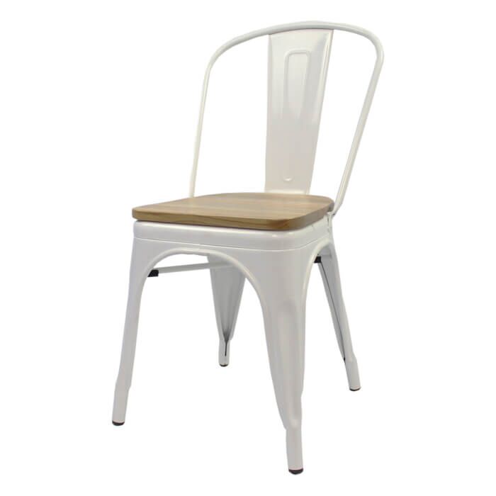 One of our more popular selling bistro chairs, the White Tolix-inspired Side Chair with Wooden Seat, offers a raw varnished finish, which gives the chair its industrial quality. This finish most reflects the age of the design and sits comfortably next to all surfaces. The industrial finish is seen in the slight differences in colour due to the variations in the original metal sheet. In addition, the welds and joins used to assemble the chair can be seen under the varnish, which all adds to the industrial look of the chair.
